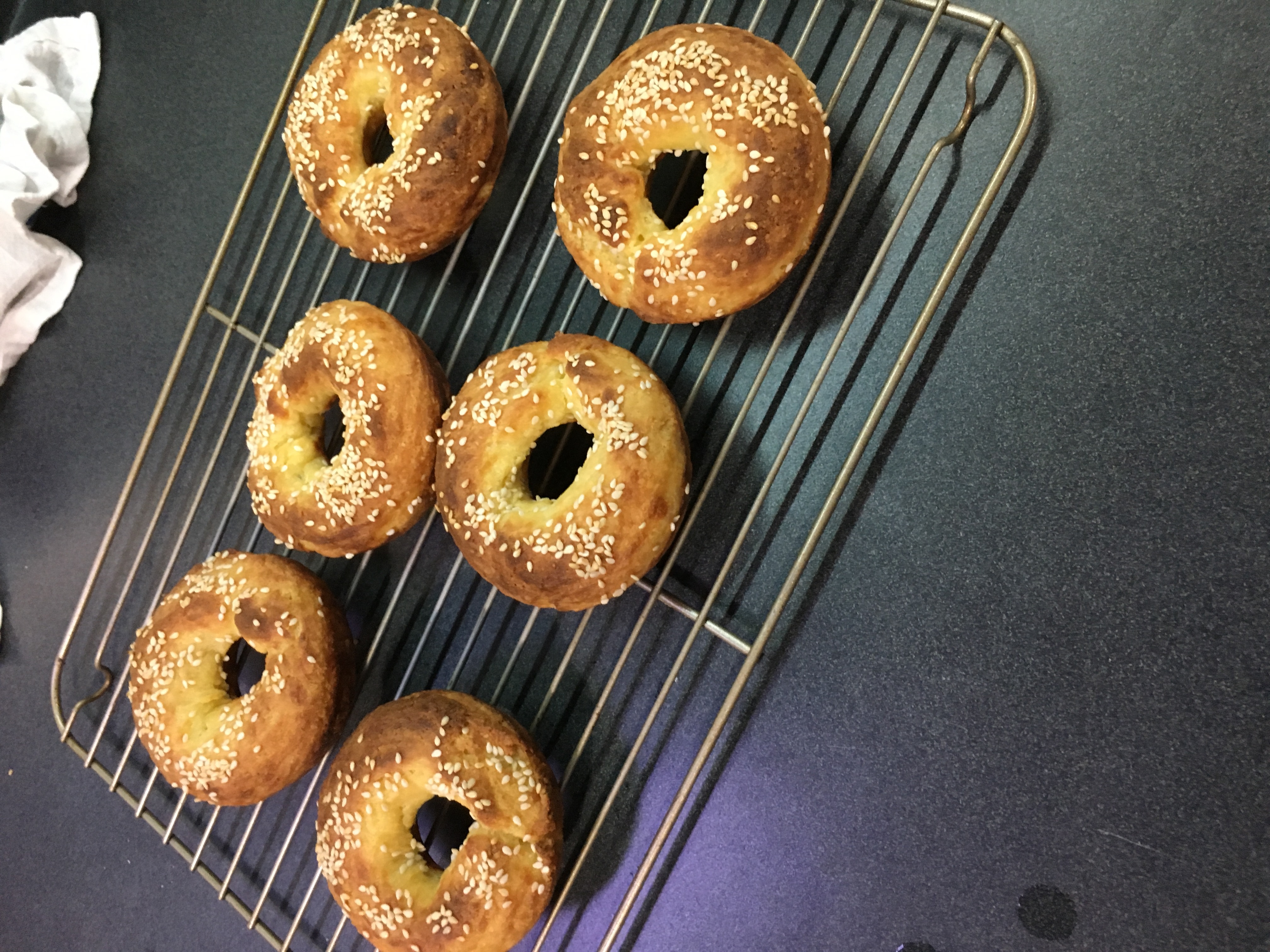 7. Place bagels in the oven for about 18 minutes. Keep an eye on them. The tops should go golden brown. Take the bagels out of the oven and allow to cool.
