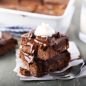 - Pour batter into cake pan or brownie pan and bake for 30 minutes (or until a toothpick comes out clean)