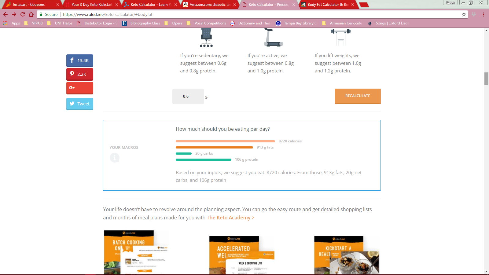 Howdy. I use the keto calculator to get my baseline number to start and it gave me the following: 1728 calories. (128g fats, 25g net carbs, and 118g protein) I downloaded the Cronometer app to help me track food intake, etc. and used their calculator with the same input data and it is giving me: 1815 calories (171g fats, 25g net carbs and 44g protein) – the discrepancy of 100 cals is not an issue, but the variance in fats and 2/3 less protein seems way off. Any ideas what’s up? Which do I follow for maximum ketosis? Please advise!