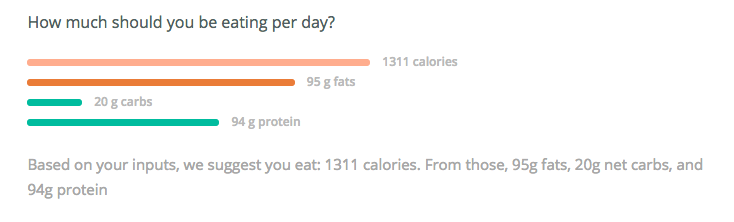 With my height, weight and body fat it tells me to ea “2100 calories. From those, 170g fats, 20g net carbs, and 122g protein”