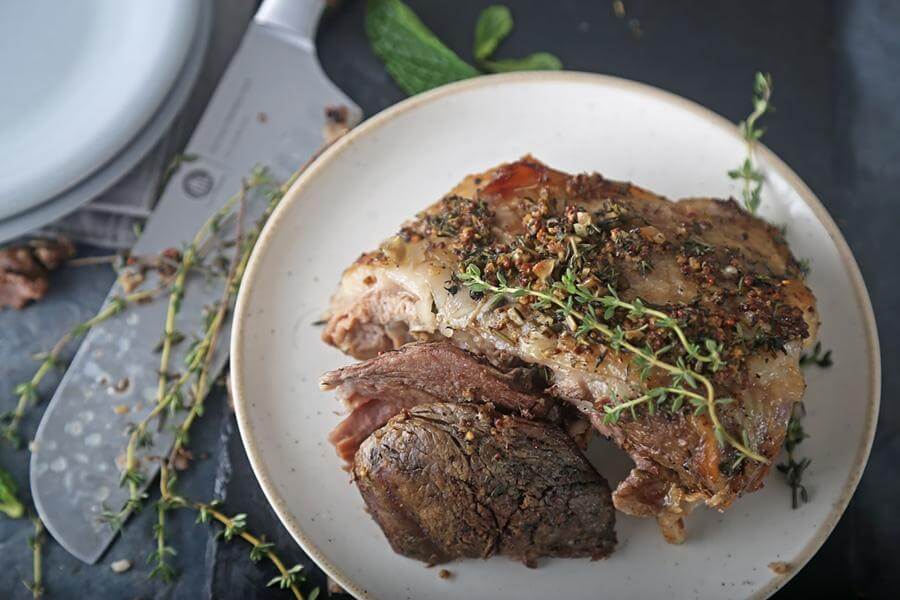 3. Place the garlic and rosemary inside the slits. Cook on low for 7 hours. Once the lamb is cooked down and surrounded by juices, add the thyme and mint. Cook for an additional 1 hour with the herbs in the juices.