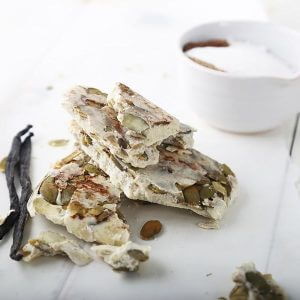 - Once the mixture has set, remove from dish and break into equal pieces. I put a little more chopped pumpkin seeds on top.
